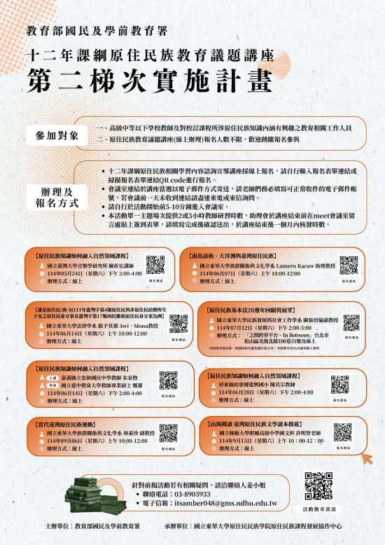 針對前揭活動若有相關疑問,請洽聯絡人國立東華大學宜花區原住民族課程發展協作中心姜小姐,聯絡電話:03-8905933;電子信箱:itsamber048@gms.ndhu.edu.tw。 |