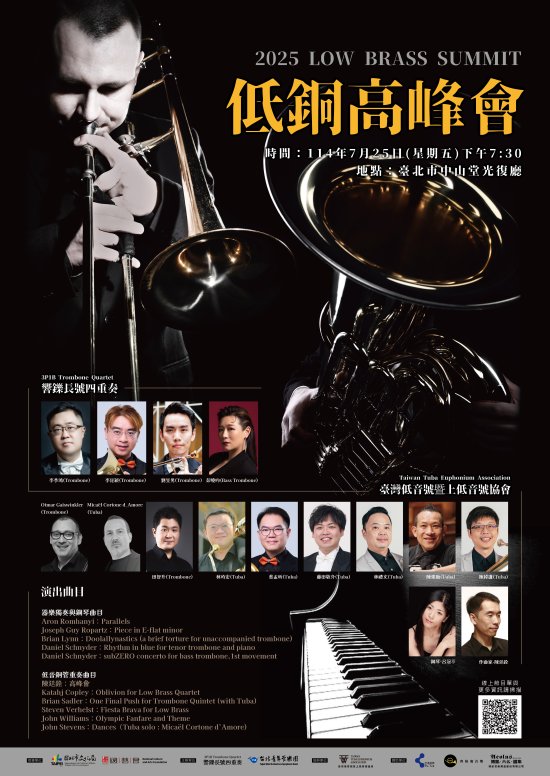 一、 | 由臺灣職業樂團長號首席與國家交響樂團低音長號彭曉昀老師組成的響鑠長號四重奏,將帶來一連串精彩萬分的長號獨奏與重奏曲目。更邀請國內外低音號演奏名家一同參與,是一場不可錯過,精彩萬分的低銅音樂饗宴 |