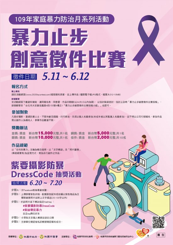 二、為落實「暴力止步」,提昇民眾對於家庭暴力及兒少、老人保護的敏感度,該中心109年家暴防治月規劃以創意徵件方式宣傳反家暴活動。