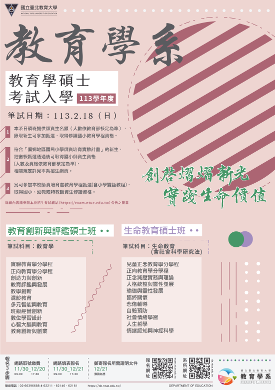 轉知國立臺北教育大學教育學系「教育創新與評鑑碩士班」、「生命教育碩士班」113學年度考試入學招生相關資訊