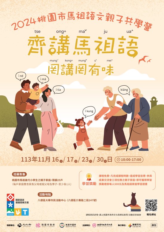 本市馬祖移民人口眾多,然馬祖語快速流失,面臨傳承危機,為推動本市馬祖語言文化之永續發展,本局特於113年11月16、17、23、30日假八德區大華市民活動中心辦理旨揭營隊課程,以本市馬祖後代小學親子家庭為招募對象,期透過親子共學推展母語家庭,受理報名期限至113年11月13日。