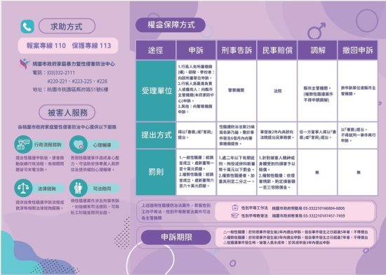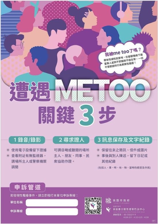 宣導本府家庭暴力暨性侵害防治中心「遭遇METOO關鍵3步」海報及「拒絕性騷擾勇敢說不要」DM各1份