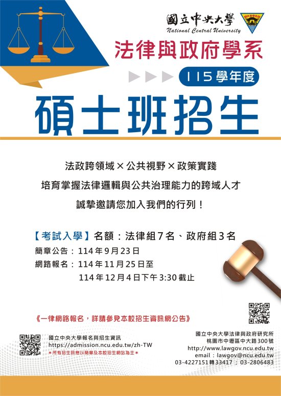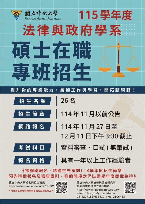 轉知國立中央大學法律與政府學系「碩士班及碩士在職專班」115學年度招生資訊